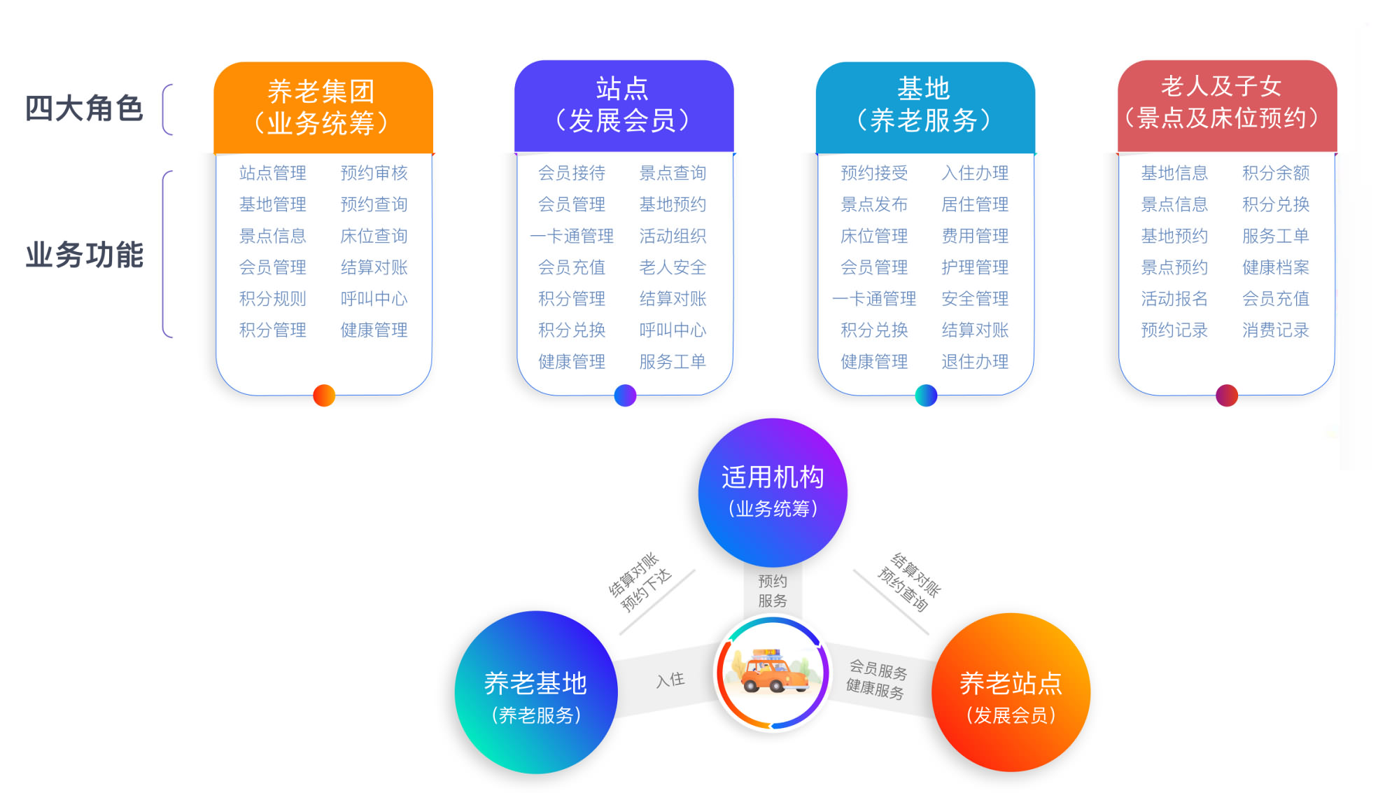 站点发展会员、集团统筹业务、基地提供养老服务,三大业务角色分工明确,流程科学规划,有效保障业务流转。